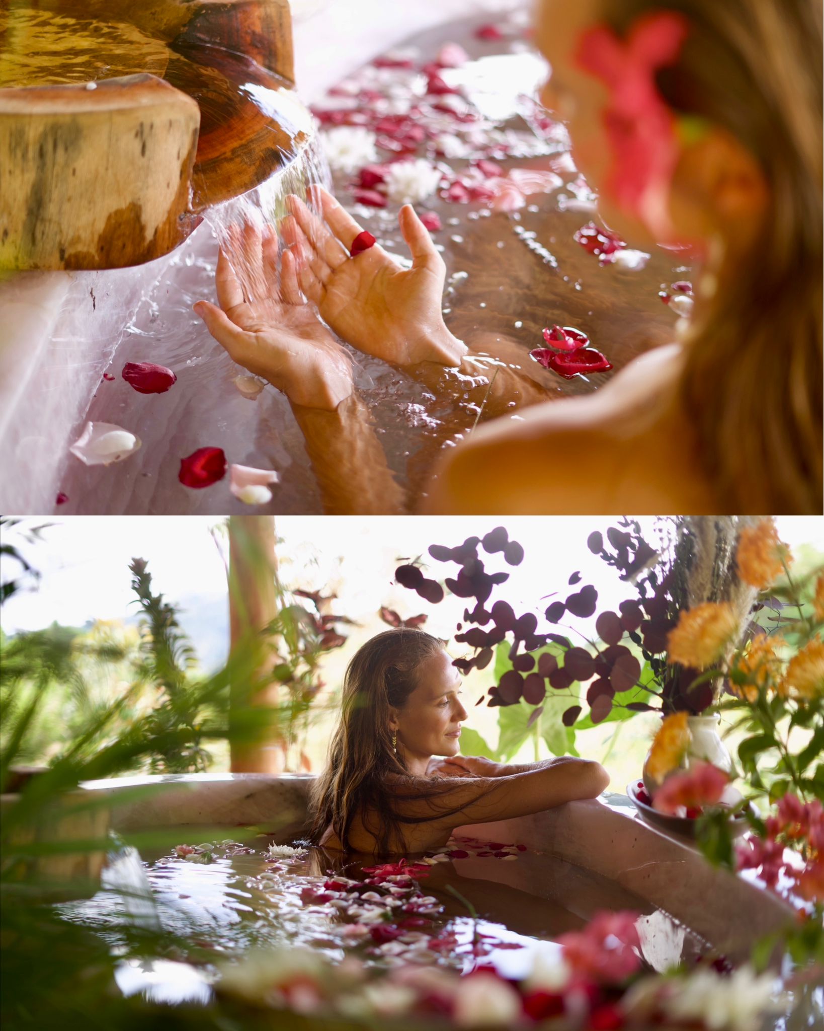 The Spa · rose quartz tub · 3:4 portraitRose quartz tub, red light therapy, bioresonance, limpia flower baths. For when the body asks for more.